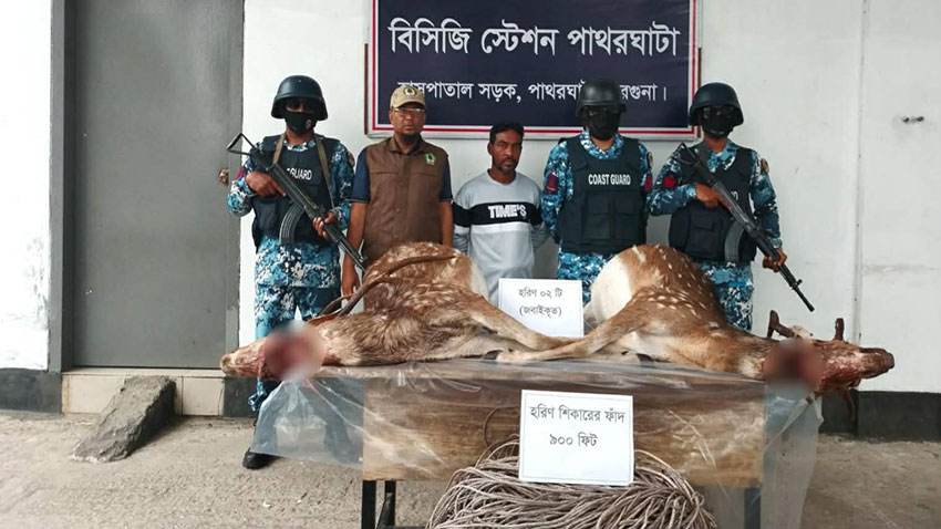 বরগুনার পাথরঘাটায় কোস্ট গার্ডের অভিযানে ২টি জবাইকৃত হরিণ ও হরিণ শিকারের ফাঁদসহ ১ হরিণ শিকারি
