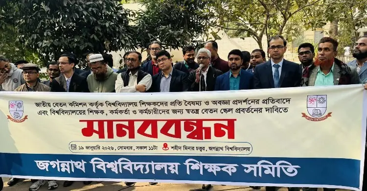 স্বতন্ত্র বেতন স্কেলের দাবিতে জবি শিক্ষক সমিতির মানববন্ধন