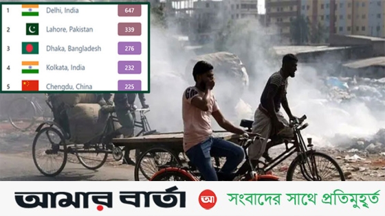 বায়ুদূষণে বিশ্বের শহরগুলোর তালিকায় ৬৪৭ স্কোর নিয়ে শীর্ষে রয়েছে ভারতের দিল্লি, শহরটির বাতাসের মান ‘বিপজ্জনক’। এদিকে ২৭৬ স্কোর নিয়ে তৃতীয় অবস্থানে রয়েছে বাংলাদেশের রাজধানী ঢাকা। যার বাতাসের মান ‘খুব অস্বাস্থ্যকর’ বলে বিবেচিত হয়।