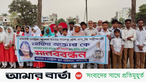 ঢাকার ধামরাইয়ে এসএসসি পরীক্ষার্থী নাদিয়া হত্যার আসামি শামীম ওরফে স্বপনের(৩৬) ফাঁসির দাবিতে মানববন্ধন করেছে সেন্ট্রাল স্কুলের শিক্ষার্থী ও শিক্ষকরা।