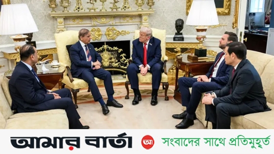 গত বছরের সেপ্টেম্বরে হোয়াইট হাউসে মার্কিন প্রেসিডেন্ট ডনাল্ড ট্রাম্পের সঙ্গে সাক্ষাৎ করছেন পাকিস্তানের প্রধানমন্ত্রী শেহবাজ শরিফ ও সেনাপ্রধান ফিল্ড মার্শাল আসিম মুনির। ছবি: সংগৃহীত