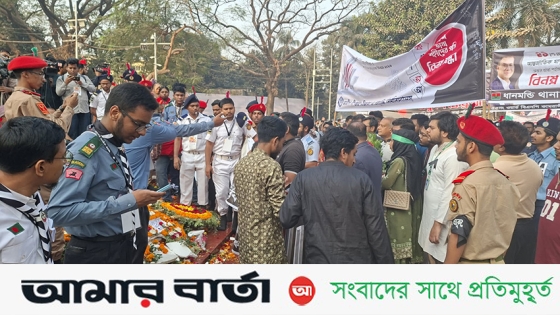 অমর একুশের প্রথম প্রহরে কেন্দ্রীয় শহীদ মিনারে পুষ্পস্তবক অর্পণের মাধ্যমে ভাষা শহীদদের প্রতি গভীর শ্রদ্ধা